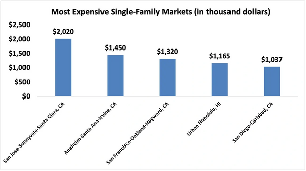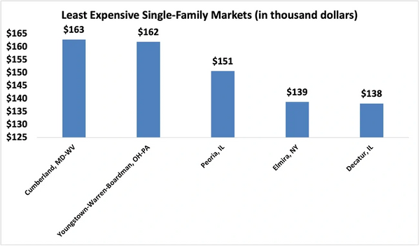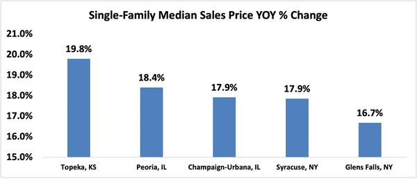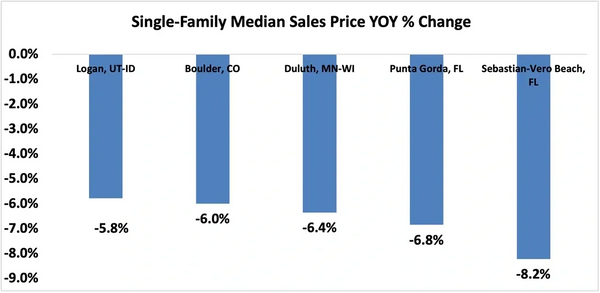 Here is a look at the metro areas with the strongest price growth in the first quarter of 2025, as well as a look at the yearly change in median existing single-family home prices among the top five highest and lowest growth metro areas of the first quarter of 2025.